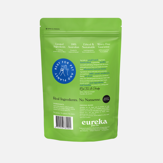 Unlike raw, Eurekas' unique air-drying process involves a "kill step," which eliminates pathogens, removing any food safety risks and making your dog’s ongoing health a priority. We utilise solar oven technology to significantly reduce our energy consumption and impact on the environment. This process means Eureka dog food is dry enough to last for weeks after opening but has enough moisture to eat without any additional preparation. You'll notice that you feed a lot less on Eureka air dried dog food because there are zero fillers which means you'll also be picking up a lot less poo!