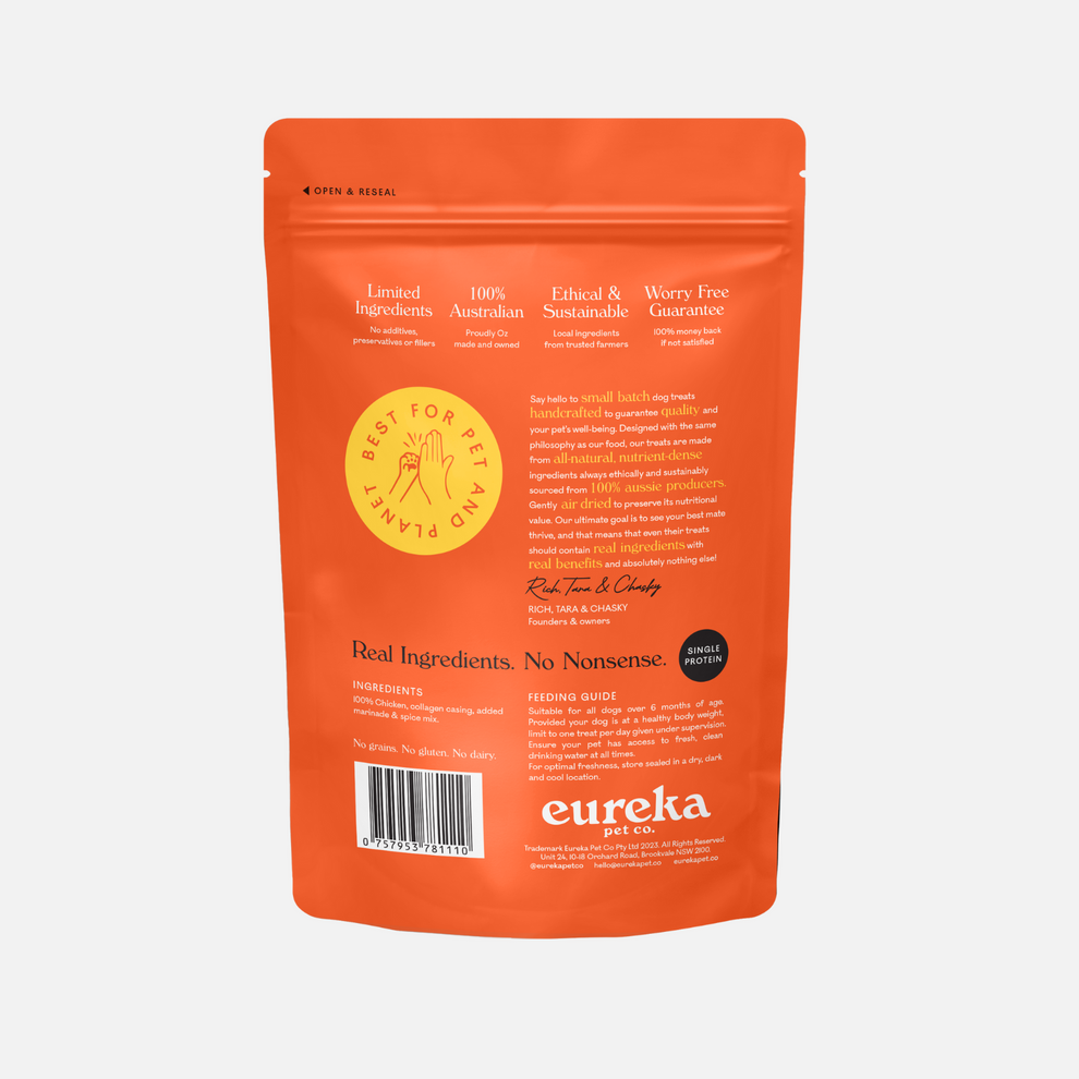 Unlike raw, Eurekas' unique air-drying process involves a "kill step," which eliminates pathogens, removing any food safety risks and making your dog’s ongoing health a priority. We utilise solar oven technology to significantly reduce our energy consumption and impact on the environment. This process means Eureka dog food is dry enough to last for weeks after opening but has enough moisture to eat without any additional preparation. You'll notice that you feed a lot less on Eureka air dried dog food because there are zero fillers which means you'll also be picking up a lot less poo!