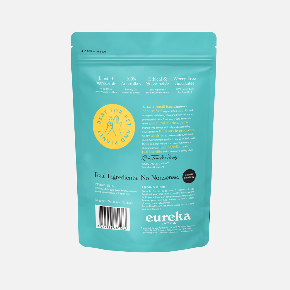 Unlike raw, Eurekas' unique air-drying process involves a "kill step," which eliminates pathogens, removing any food safety risks and making your dog’s ongoing health a priority. We utilise solar oven technology to significantly reduce our energy consumption and impact on the environment. This process means Eureka dog food is dry enough to last for weeks after opening but has enough moisture to eat without any additional preparation. You'll notice that you feed a lot less on Eureka air dried dog food because there are zero fillers which means you'll also be picking up a lot less poo!