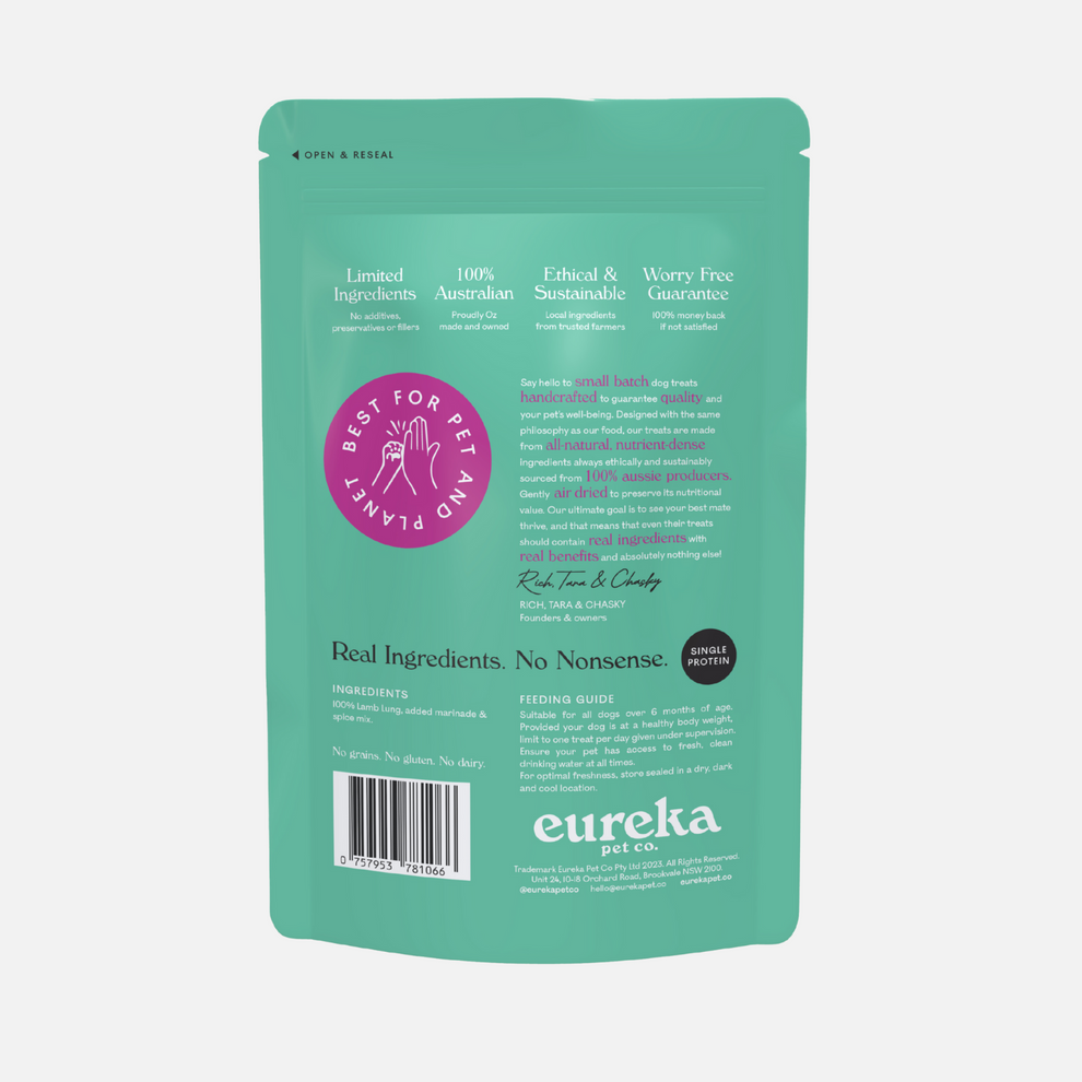 Unlike raw, Eurekas' unique air-drying process involves a "kill step," which eliminates pathogens, removing any food safety risks and making your dog’s ongoing health a priority. We utilise solar oven technology to significantly reduce our energy consumption and impact on the environment. This process means Eureka dog food is dry enough to last for weeks after opening but has enough moisture to eat without any additional preparation. You'll notice that you feed a lot less on Eureka air dried dog food because there are zero fillers which means you'll also be picking up a lot less poo!
